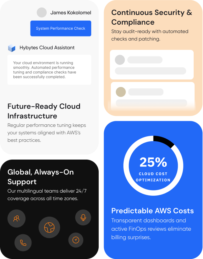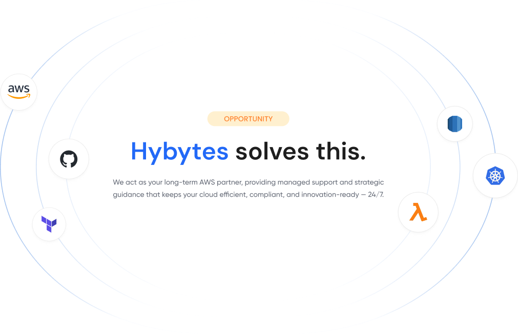 Cloud migration is only the beginning. Hybytes provides 24/7 support, continuous optimization, and proactive monitoring to ensure your AWS environment stays secure, efficient, and future-ready.